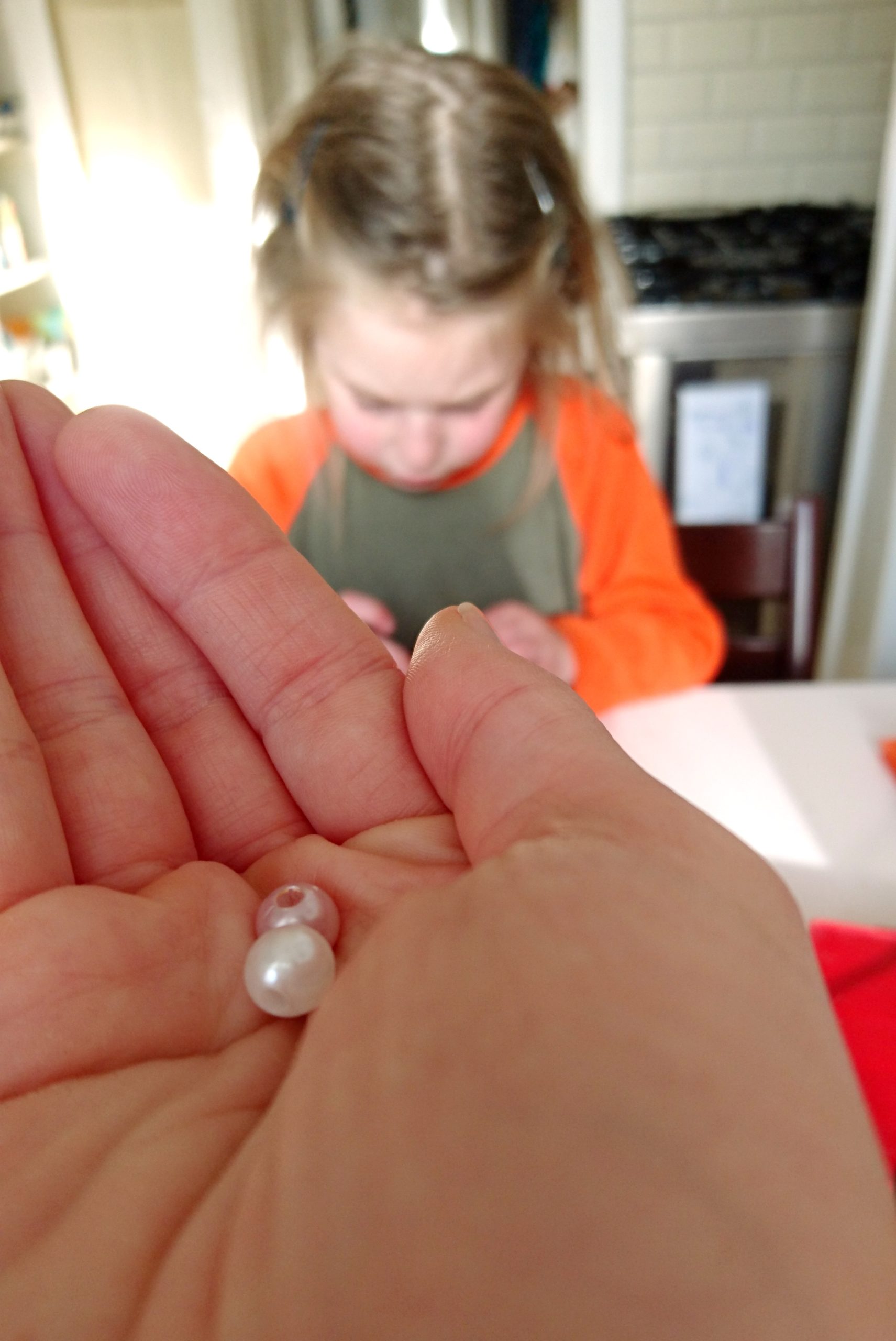 אז השבוע, בגיל המופלג של 4 ו – ¾ (כמו שהיא אוהבת להכריז), ד׳ החליטה לבדוק האם חרוזים יכולים להיכנס לאף שלה. התשובה היא כן, אבל השאלה החשובה יותר, כך היא למדה, היא האם הם יכולים לצאת. במקרה זה התשובה הייתה כן ולא (מנחיר ימין ושמאל, בהתאמה).