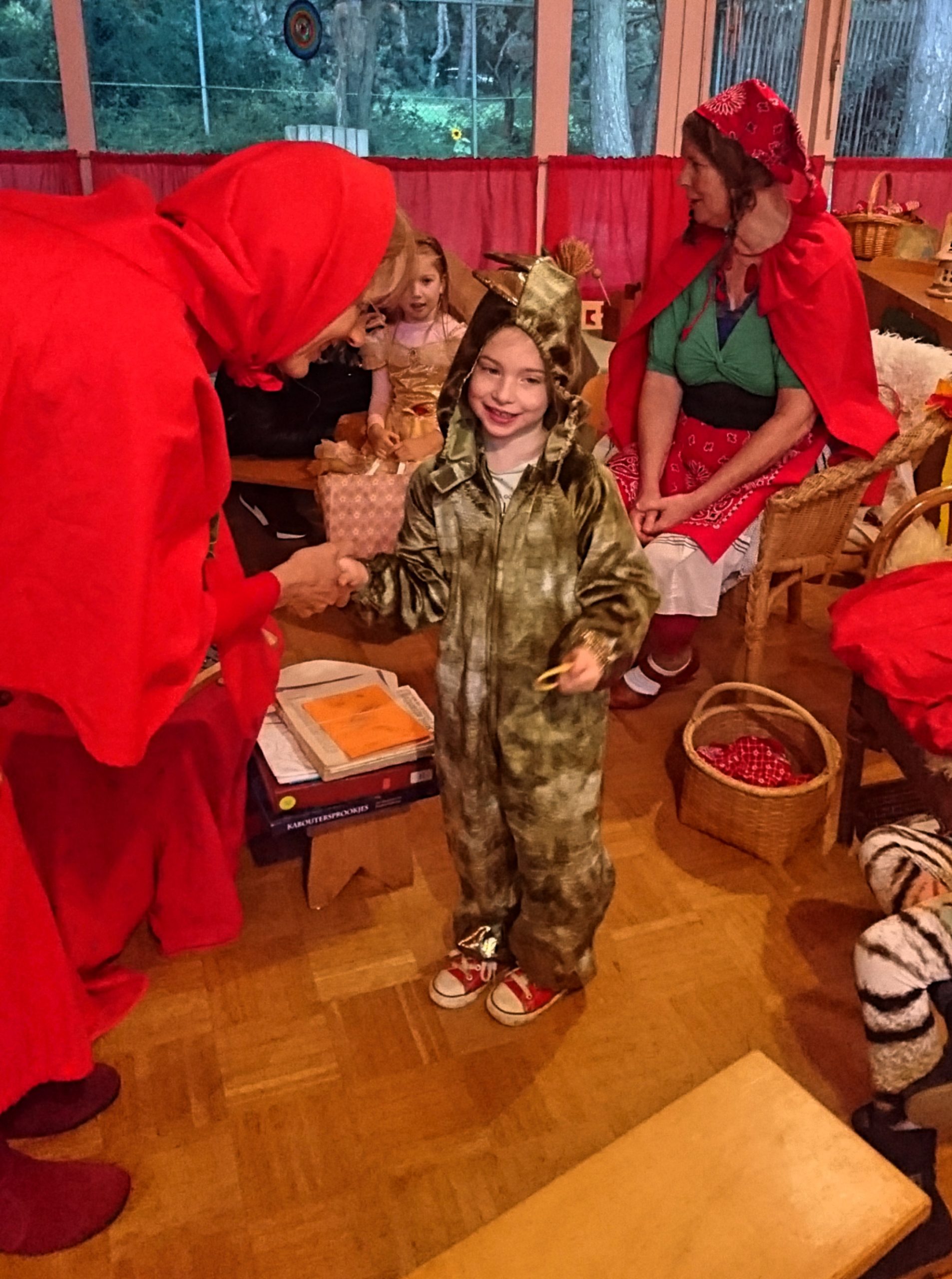 החגיגה עצמה הייתה מאוד נחמדה: שתי המורות הגיעו מחופשות לכיפה אדומה, הילדים נתנו להן פרחים וציורים ושאר תשורות שהביאו מהבית (אנחנו הבאנו עוגיות ש – ד׳ אפתה עם ר׳), וההורים, שהשתהו בכיתה קצת יותר בבוקר כדי לחגוג יחד נתנו ״להן״ מתנה (למעשה זו מתנה שנשארת בכיתה) ושרנו שירי יום הולדת בהולנדית (כולם), אנגלית (כולם), הונגרית (האמא ההונגרייה), עברית (כן, נאלצתי לשיר לבד), יוונית (האמהות מקפריסין ומיוון) ואיטלקית (לא ברור מי).