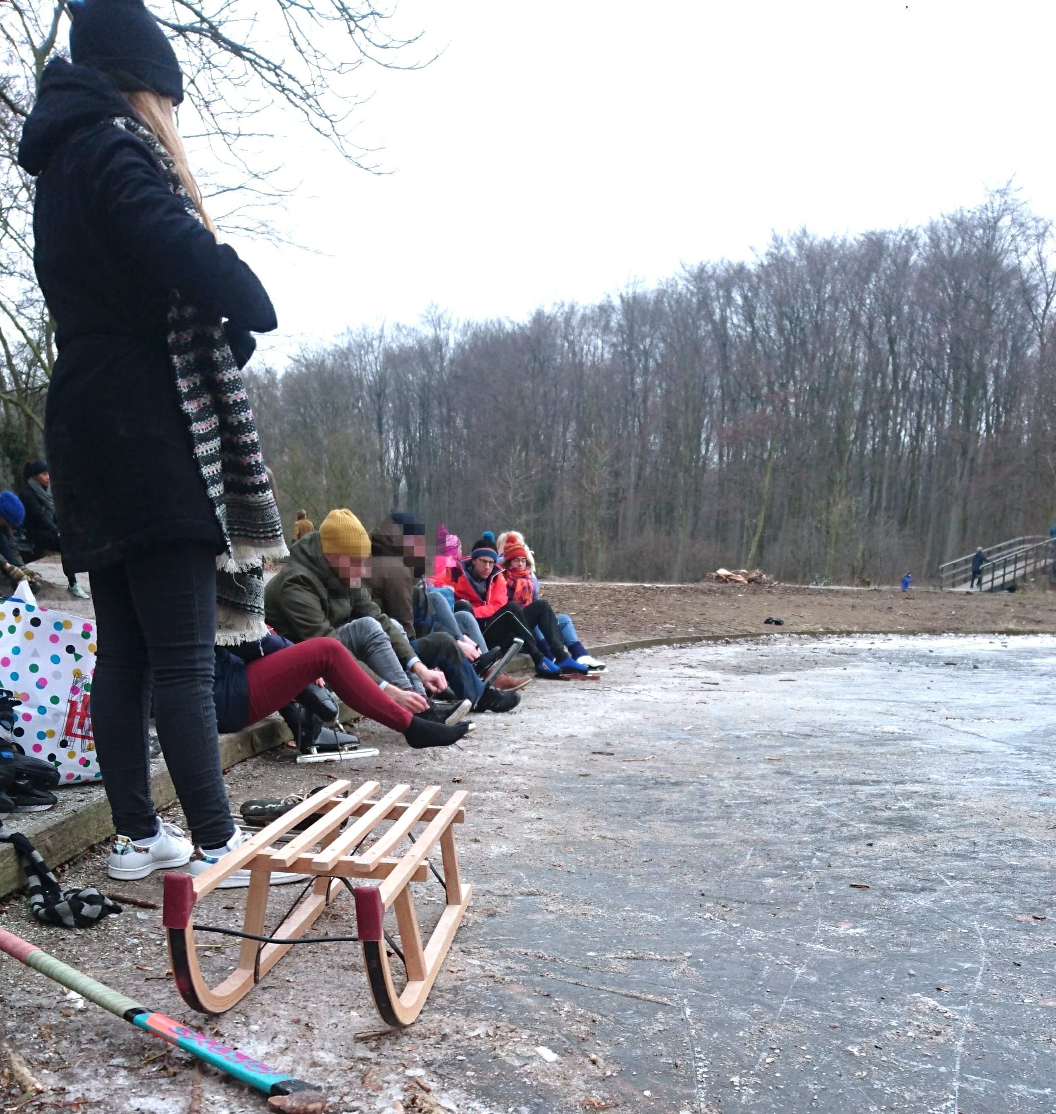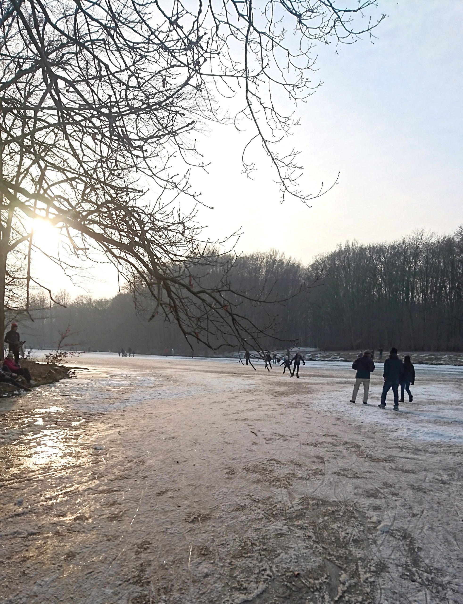 האגם בחורשה קפא והיה מלא באבות עם מחליקיים שדחפו עגלות, ילדים עם מחליקיים שנעזרו בכיסא, משפחות שלמות שפתחו שולחן על הקרח (טוב, פיגורטיבית, לא באמת), זוגות מחליקים אחד לצד השני, אחד לכיוון השני, ונפגשים ומתחבקים כמו בסרטים, אב שמאמן את בנו בהוקי קרח, חבורת צעירים שהחליקו בשיא המהירות ובאלגנטיות עד שאחת מהם נפלה וכולם רצו להרים אותה ועוד ועוד.