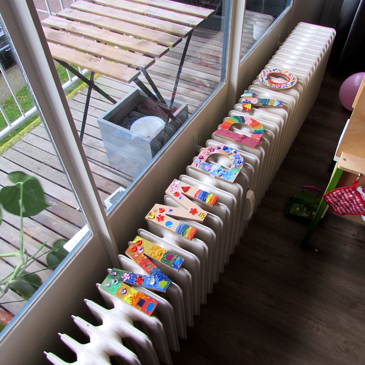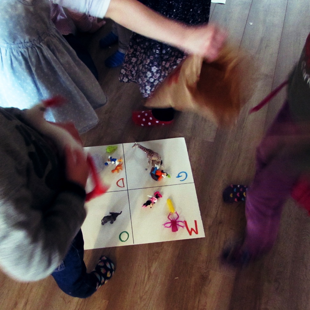 קצת הסבר על המשחק: פעילות היצירה תוכננה להיות עם אותיות, לכן רצינו משחק שיוביל לזה. הכנו שני לוחות לשתי קבוצות, עם האות הראשונה של שמות חברי הקבוצה. כל קבוצה קיבלה שקיק עם צעצועים והייתה צריכה להניח במשבצת הנכונה צעצועים שמתחילים באותה אות (בתמונה: הקבוצה של Otis הניחה פיל – Olifant ליד האות שלו). הקבוצה שמסיימת ראשונה למיין – מנצחת. המנצחים מקבלים את האות הראשונה של שמם (אבל מדובר בילדים בני חמש, לכן כולם מנצחים).