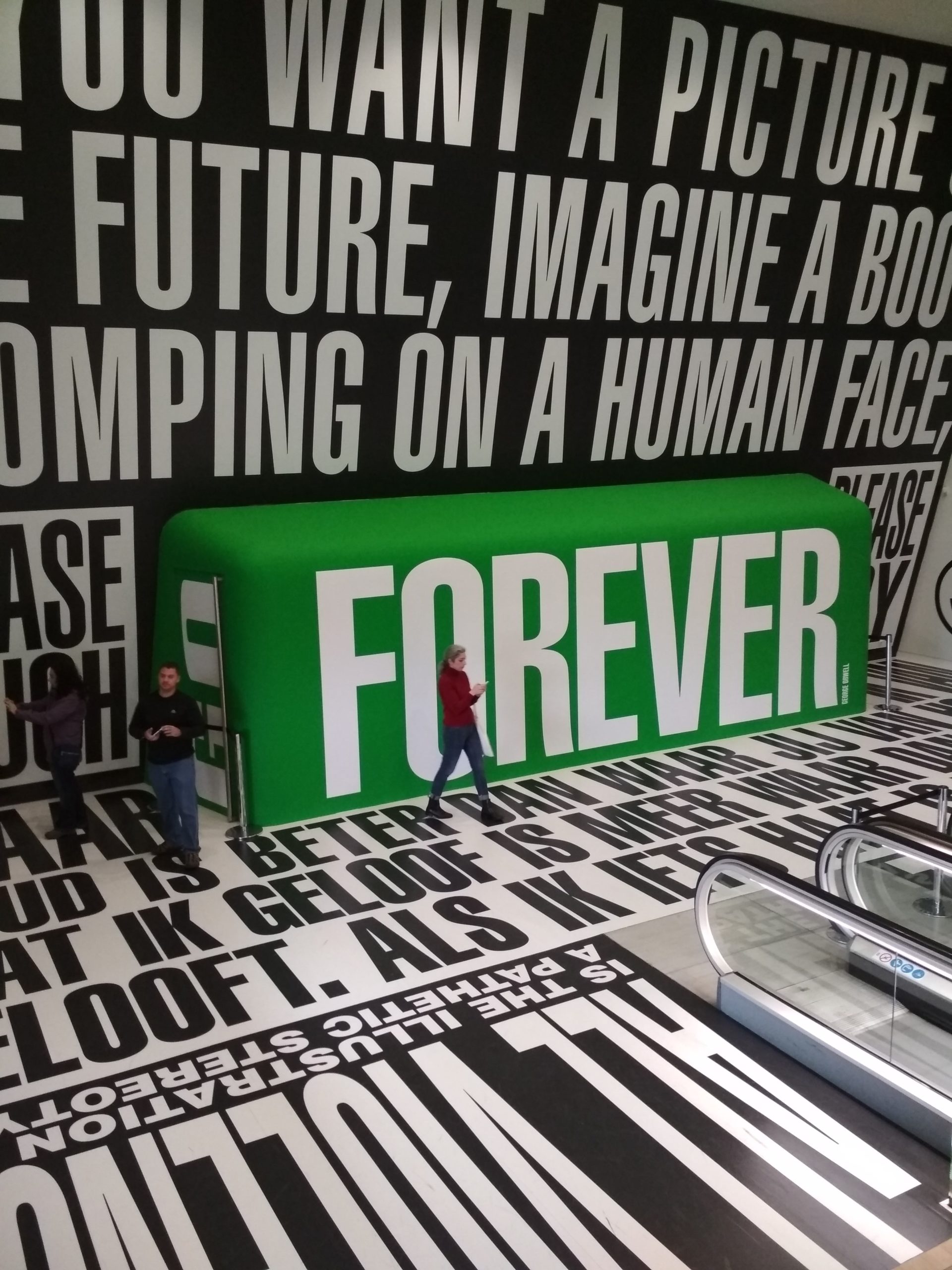 האמנית היא ברברה קרוגר (Barbara Kruger) והיצירה הזאת היא חלק מהתצוגה הקבועה של המוזיאון. היא הותאמה לו במיוחד, וקרוגר עשתה דברים דומים במוזיאונים אחרים ברחבי העולם (אפשר לקרוא עליה יותר כאן).