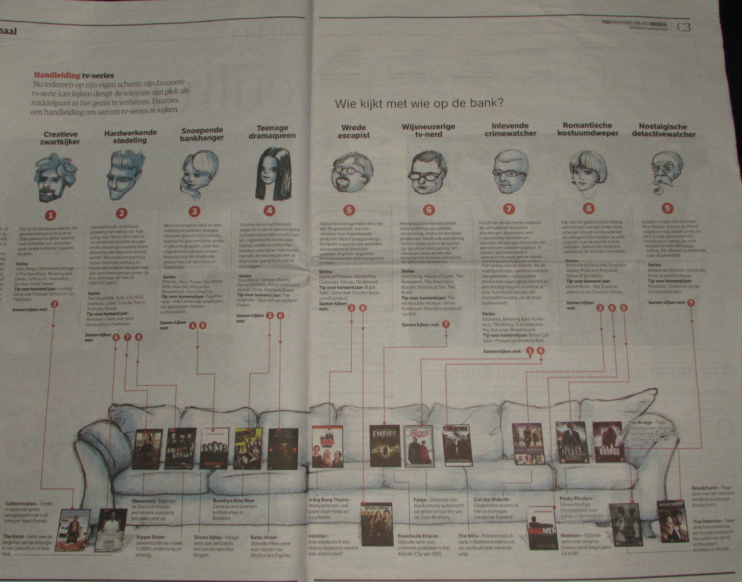 תשעה טיפוסים, מאופיינים לפי הסדרות האהובות עליהם. הקווים האדומים מראים מי יוכל לסבול אותם על אותה ספה, ובמה הם יכולים לצפות יחד.