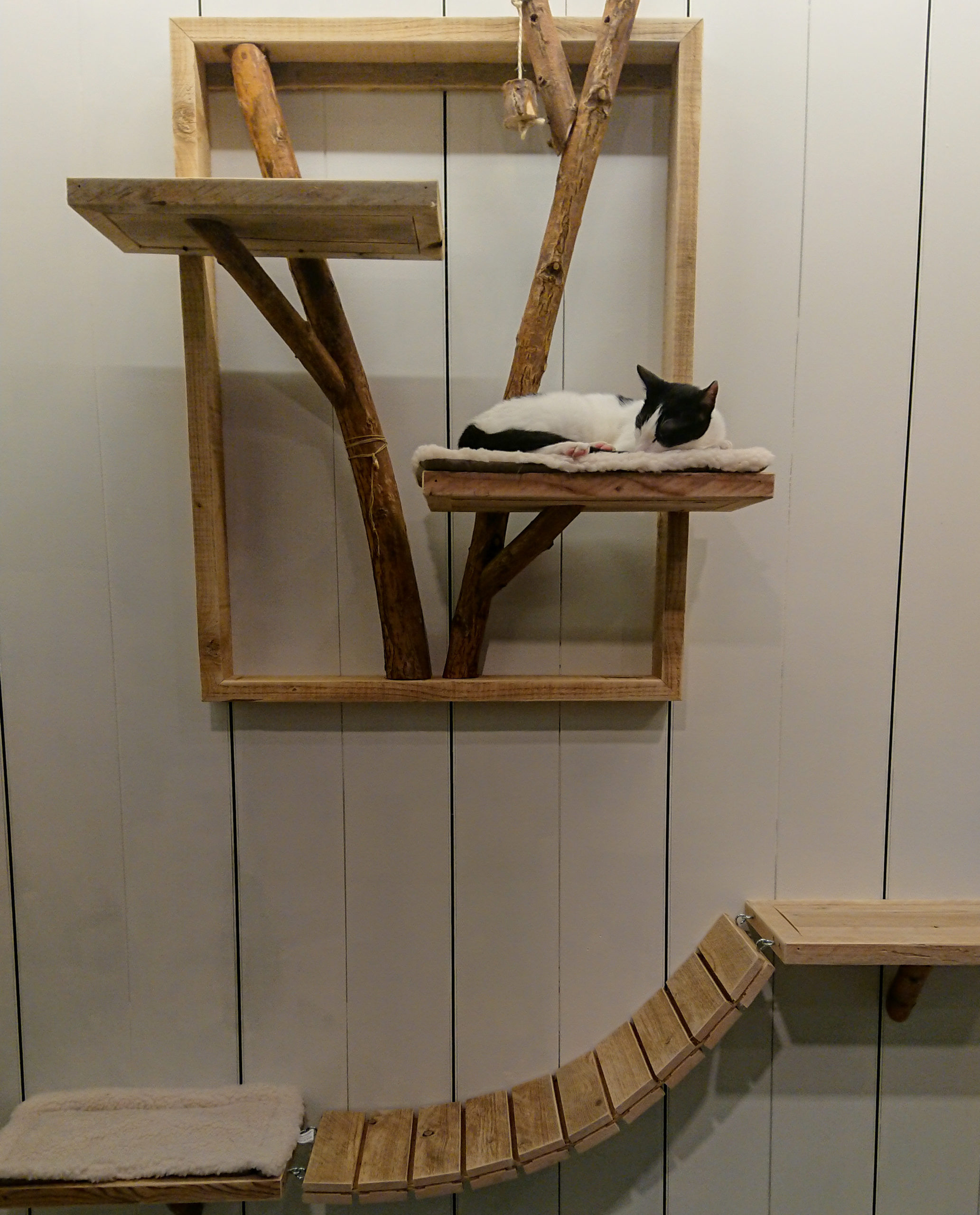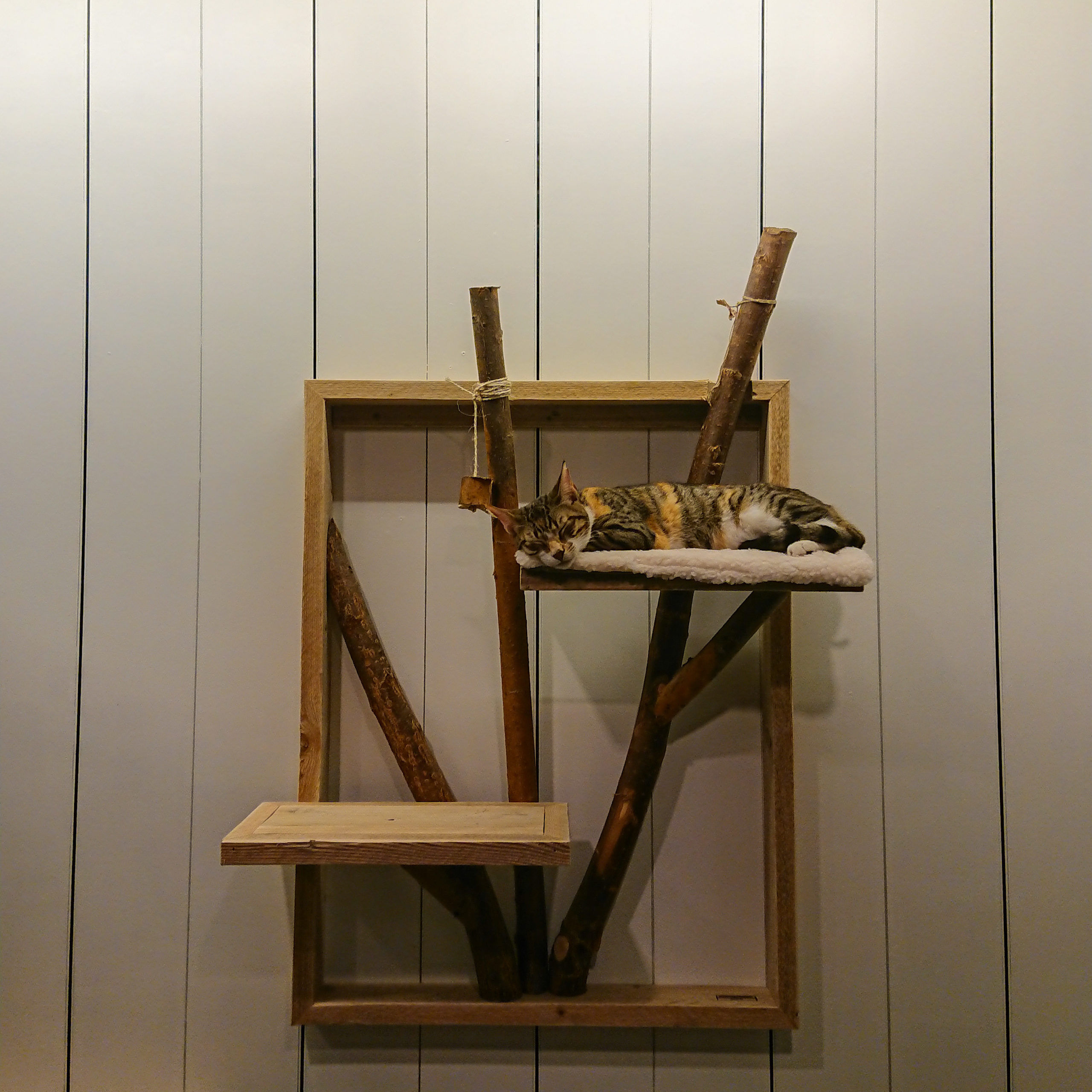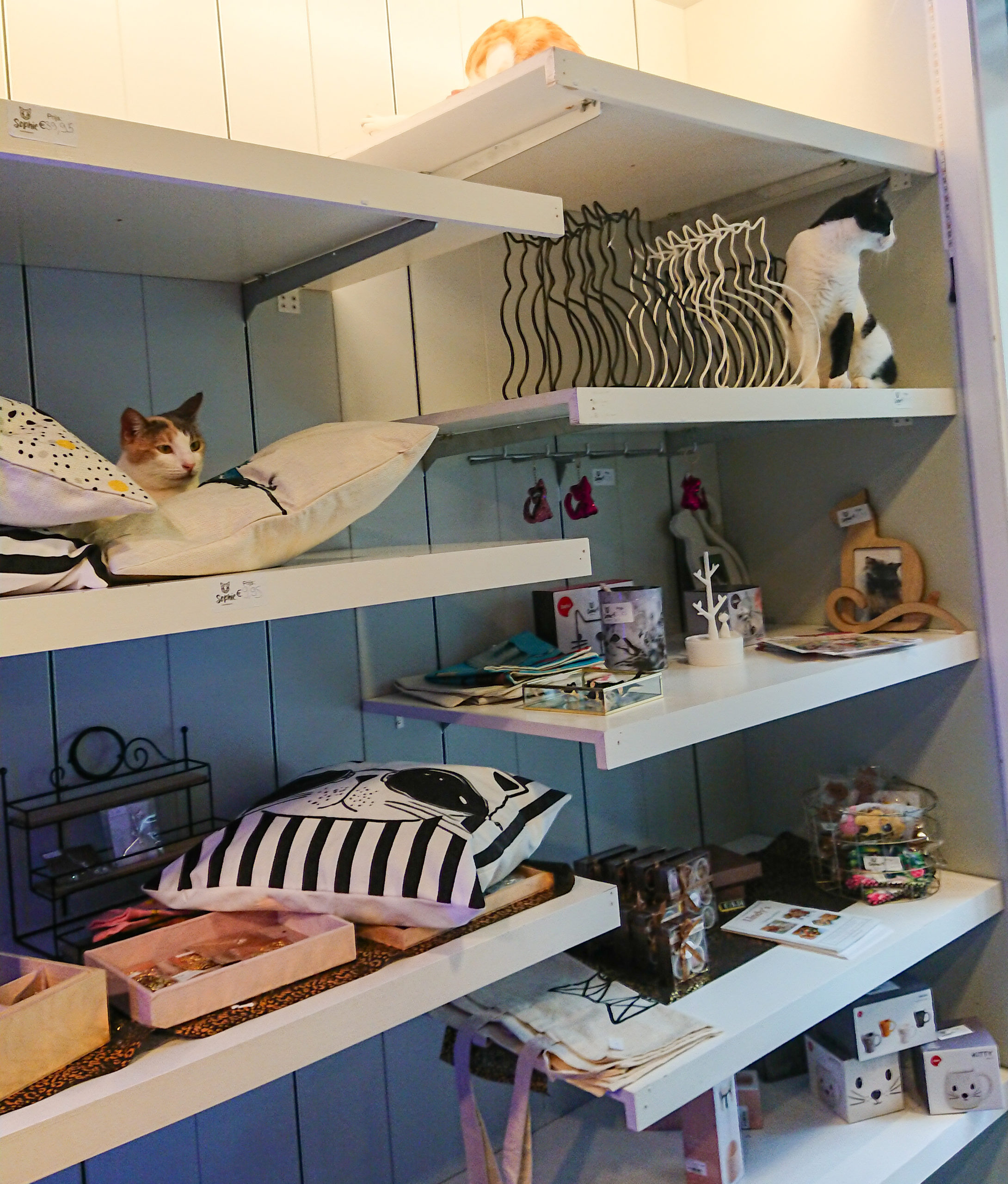כלומר, הוא מנוהל על ידי בת אנוש, אבל זה פרט טכני ושולי. למרות שנראה שיש חתולים בכל מקום– על הקירות, על מדפים, על הרצפה, ואפילו בשירותים– מסתבר שיש שם שמונה חתולים בלבד! לבעלים היה חשוב שהם יכירו אחד את השני ויסתדרו היטב, לכן כולם הגיעו מאותו מקום, מקלט לחיות עזובות ביוון.