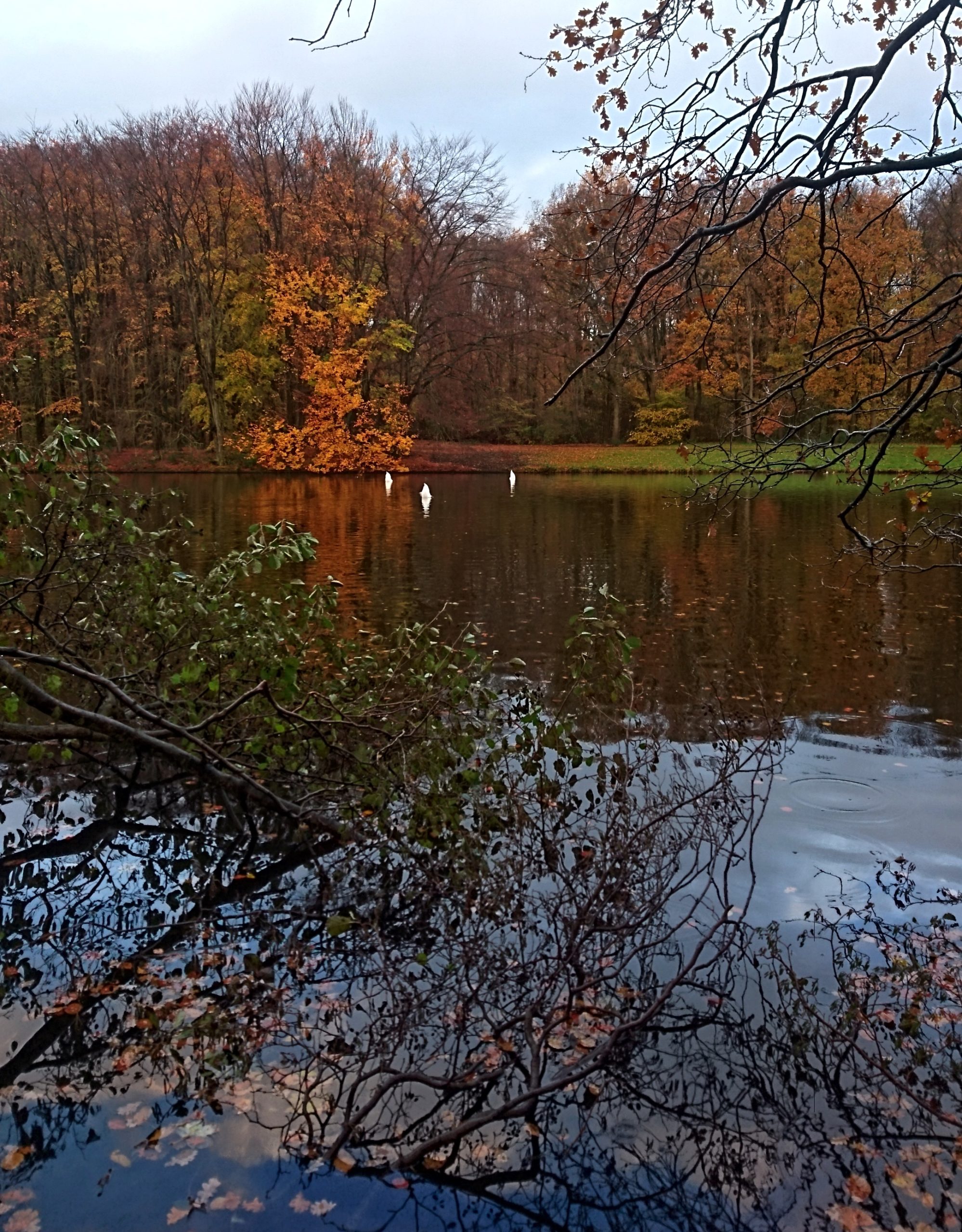 שלוש הנקודות הנלבנות במים הם הדיירים החדשים בבריכה הקטנה בחורשה. רואים רק את הטוסיק שלהם, כי מסתבר שזה מה שברבורים אוהבים לעשות, לצלול (ולהיות לא נחמדים בלי קשר).