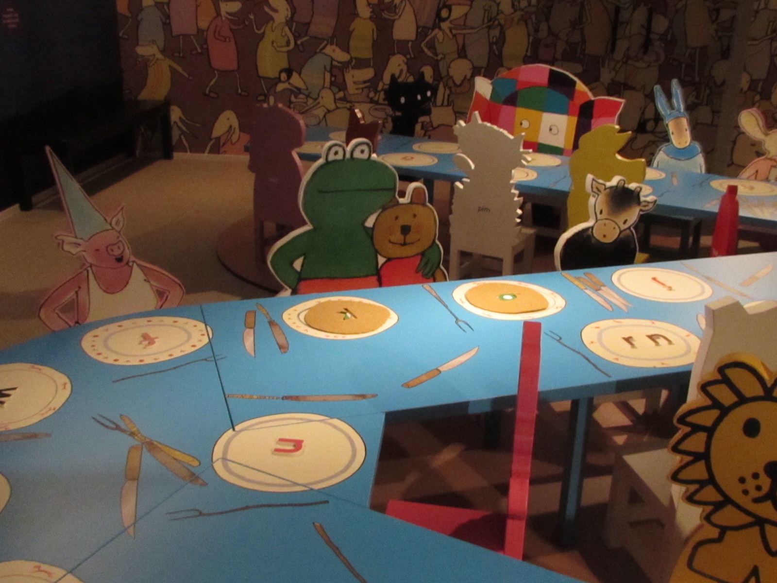 אבל מה שהכי אהבתי היה האולם המרכזי, בו ישבו כל הדמויות מכל הספרים לצד שולחנות ארוכים. על גב כל כיסא כתוב שם הדמות, לפני כל דמות – על השולחן – מצוירת צלחת גדולה ובמרכזה תבליט בצורת האות הראשונה של שם הדמות. ובפינה – כמה טיפוסי – ערימת ״פנקייקים״ ענקית, כשבכל אחד מהם פעור חור במרכזו, בצורת אחת האותיות.