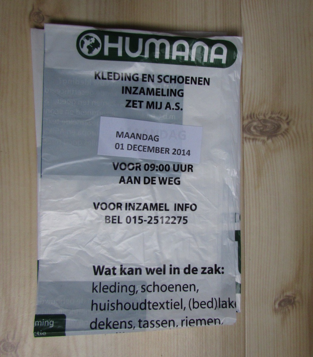 כל כמה חודשים (למרות האמור לעיל בנוגע לספאם) אנחנו מוצאים בתיבת הדואר שלנו שקית. על השקית מודפס לוגו (כל פעם של ארגון אחר) ורשימת הדברים שניתן להכניס אליה, לתרומה. הפעם מדובר בבגדים, נעליים, כלי מיטה, מגבות, צעצועים רכים ותיקים. מצורפת מדבקה עם תאריך ושעה, וביום הזה אנחנו מתבקשים להוציא את השקית לרחוב, על המדרכה לפני הבית. הם כבר יאספו.